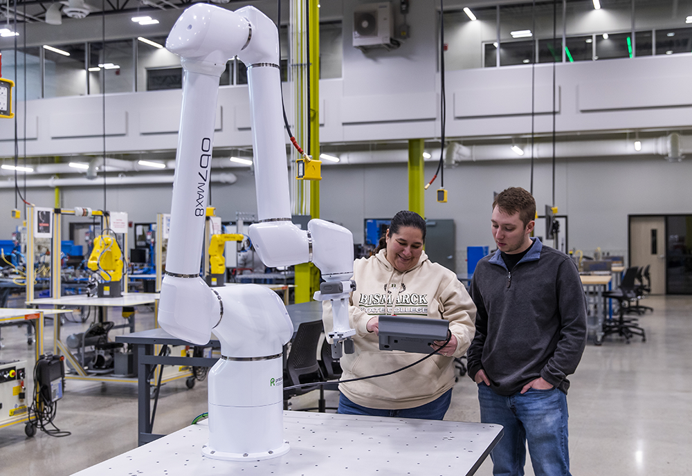 Bismarck State College students Adrianna Aguayo and Cole Edwardson use a robotic arm in the West Flex Lab at the Advanced Technology Center on campus. Both students are peer mentors and work with BSC’s XR for VR project, which uses immersive technology to connect North Dakotans with disabilities to high-wage manufacturing careers.